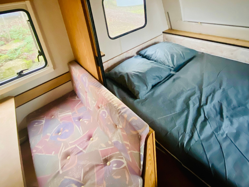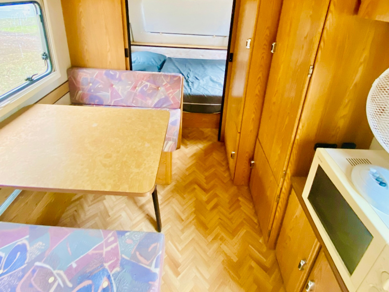 Penderie, nombreux placards, table + 2 banquettes (non dépliables), réfrigérateur top, micro-ondes, cafetière italienne, vaisselle et ustensiles de cuisine, ventilateur, rideaux occultants et moustiquaire.